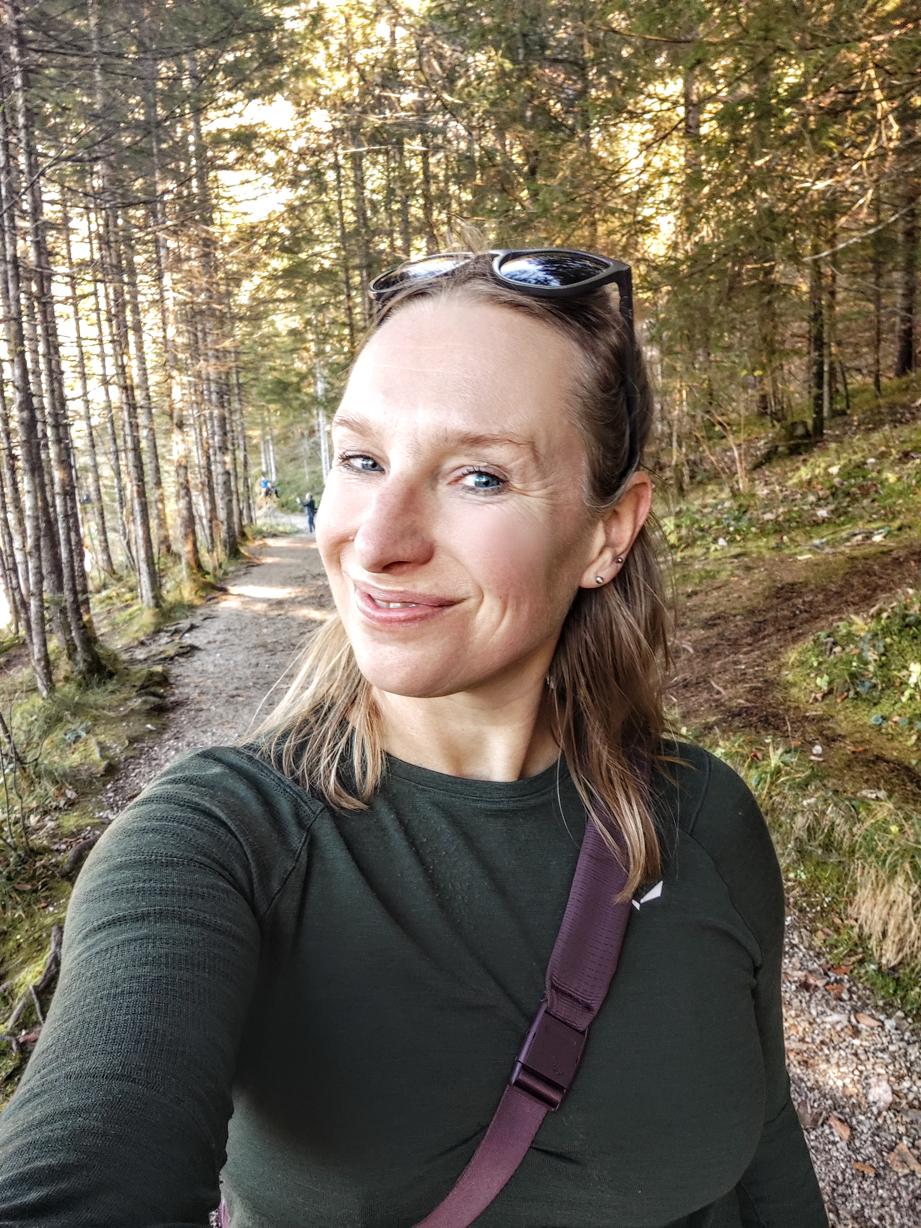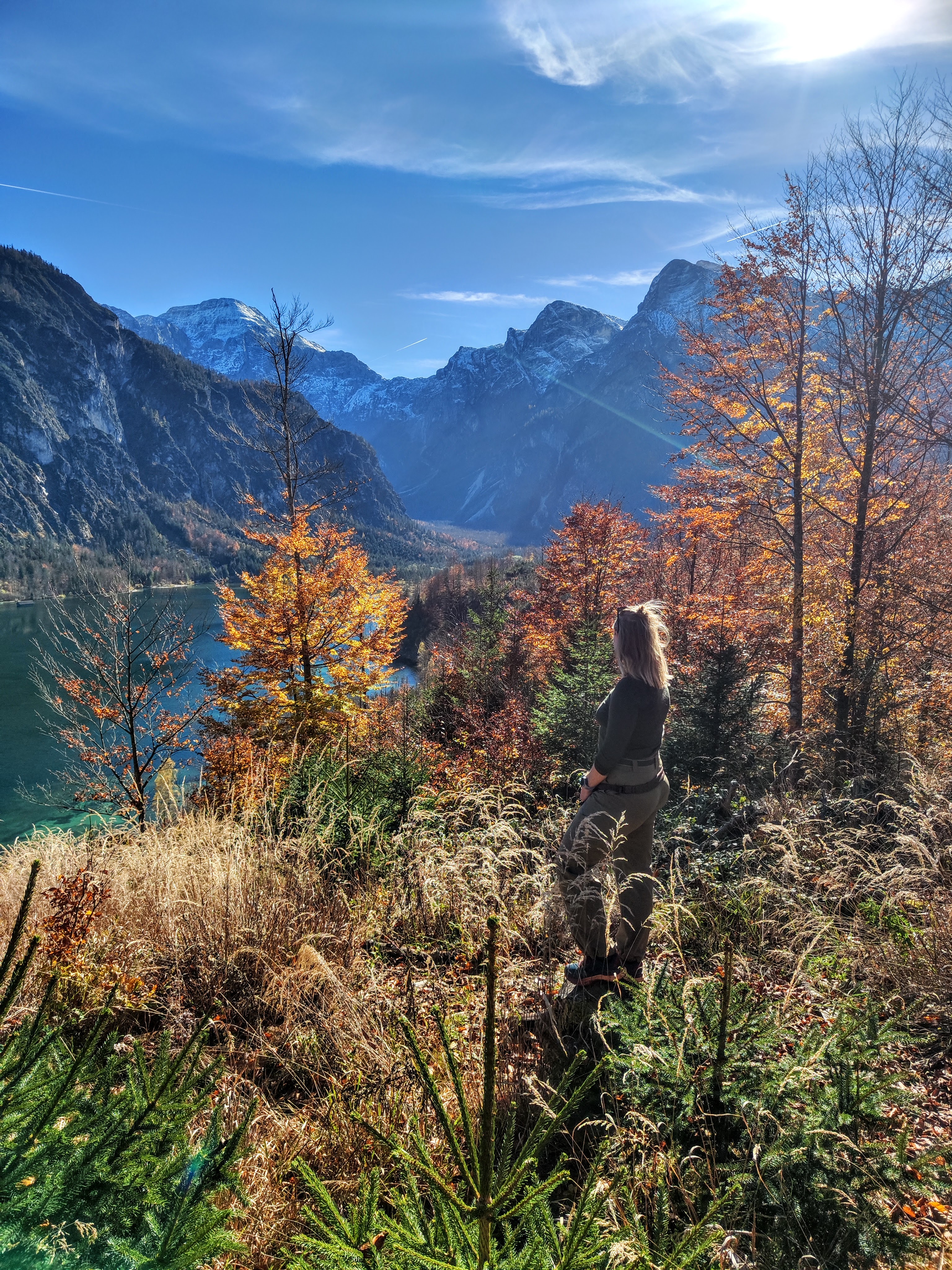 Das kleine geschnitzte Holzkreuz mit dem großen Ausblick auf den Almsee und ins Tote Gebirge – mittlerweile kein Geheimtipp mehr und deswegen auch gut besucht. Das Original-Gipfelkreuz wird scheinbar kaum beachtet – Aussicht gibt’s dort auch keine. Wem das Platzal beim Holzkreuz zu überlaufen und laut ist, sollte einfach noch ein kleines Stück weiter gehen… hab da auch für mich was anderes gefunden, die Almtaler Sonnenuhr im Blick. Aber Achtung: die markanten Nord- und Ostwände fallen fast senkrecht ab. Der Abstieg führt das erste Stück gleich retour, wer nach dem Wald-Steilstück genau schaut, sieht einen verwachsenen Pfad – meine Wahl. Er bringt mich wieder zur Forststrasse und wird scheinbar wenig begangen – Spinnweben Lifting inklusive. Hier gibts dann die Option, nach rechts ri Schwarzenbrunn auf der Forststrasse weiterzugehen (zb für eine anschliessende Seeumrundung) oder nach links ri Parkplätze. Ich bleib auf meinem bekannten Aufstiegsweg fürs retour gehen – es wäre auch auf der Forststrasse möglich aber weiter. Unten am See zieht es mich dann erst noch Richtung Seehaus & See…
