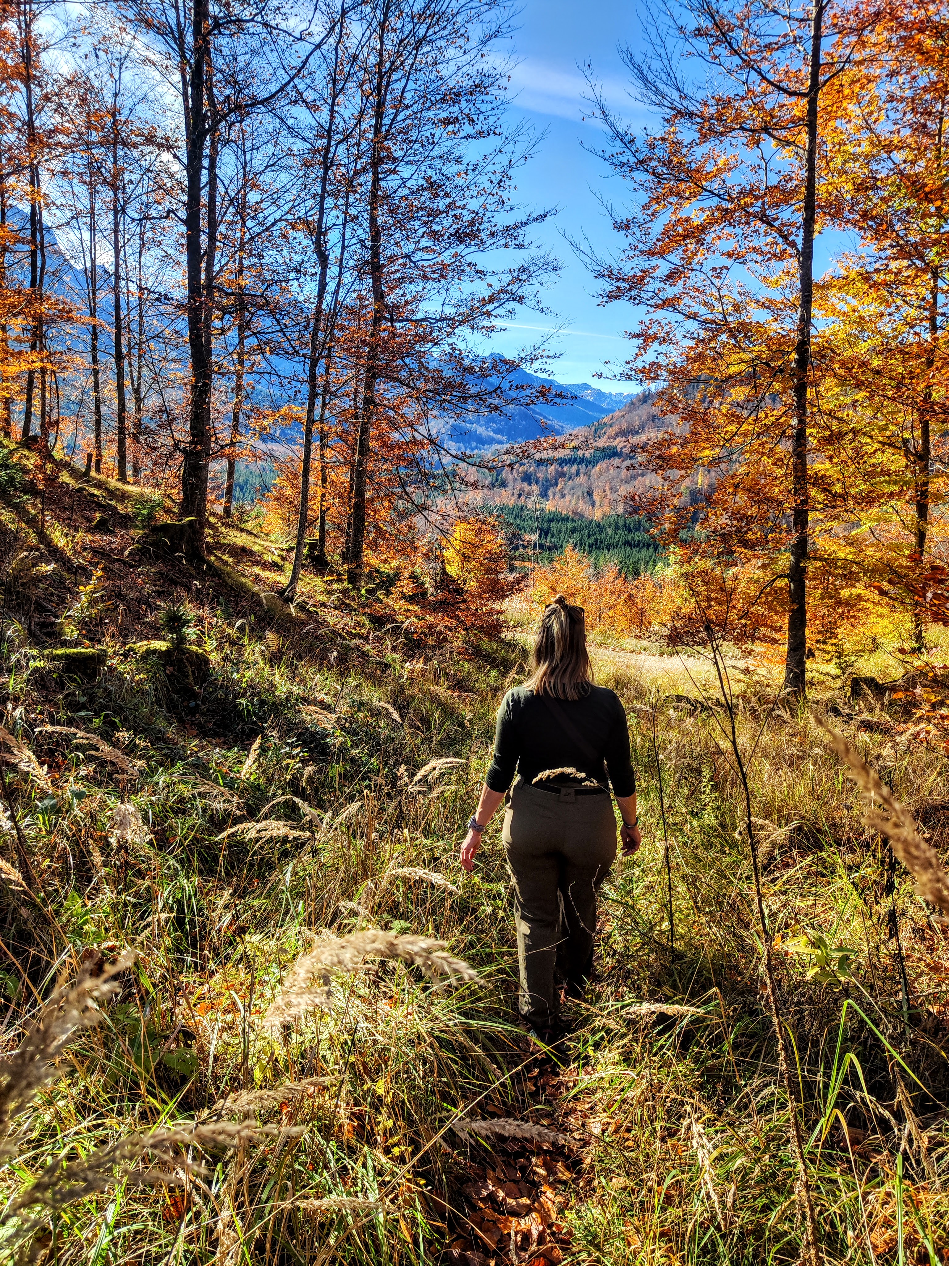 Die gelbe Markierung zum Steig 420 leuchtet mit den Laubbäumen um die Wette. Das Steigerl führt durch den Wald bergauf zur zweiten und letzten Markierung der Wanderung zum Ameisstein. Danach gehts auf mehr oder weniger gut sichtbaren Pfaden weiter – ein kurzes Stück über eine Forststrasse und danach zeigt ein Stoamandl die Richtung. Wer online auf die AV / Outdooractive Karte schaut, findet sich auch recht einfach zurecht. Und alleine ist man auch wahrscheinlich eher sehr selten dort unterwegs. Der Ameisstein ist begehrt – klar, bei dem kurzen knackigen Aufstieg zum gewaltigen Almsee-Panorama. Aber kurz noch zurück zum Stoamandl: hier biege ich nach rechts ab, dort wartet der erste Almsee-Ausblick. Danach geht’s stetig (steil) bergauf durchs Laubmeer (Vorsicht rutschig). Zum durchschnaufen quert man oben nach rechts, dann kurz bergab, um danach final bergauf zum Kreuz zu gelangen. Ameisen habe ich übrigens keine gesehen – aber der Name kommt auch vom althochdeutschen „meiz“, was Holzschlag oder Rodung bedeutet. Einen stellenweisen Kahlschlag kann man heute noch erkennen.