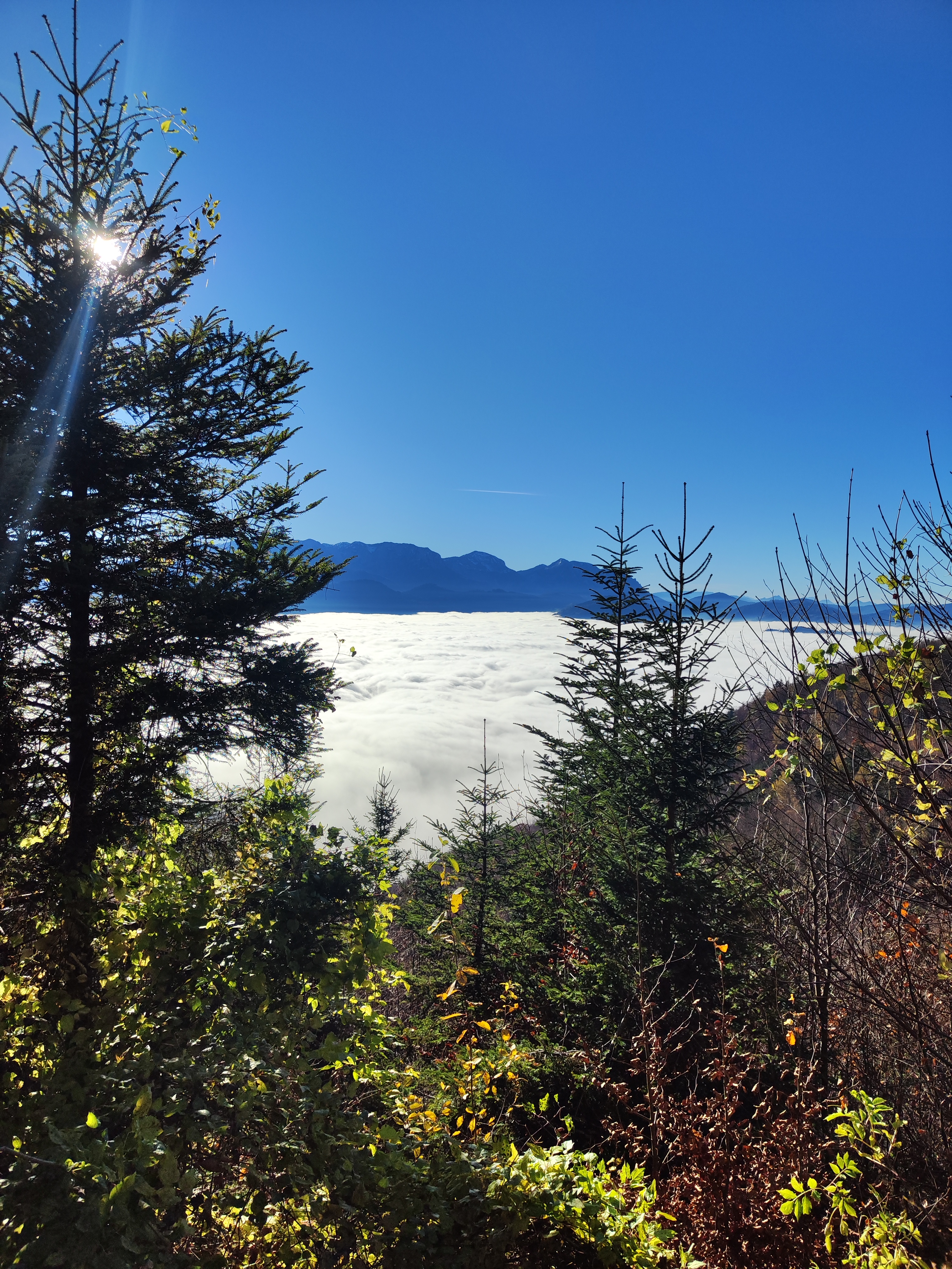 Zurück gehe ich über den Erlebnisweg – a feines kleines Steigl durch den Wald, der mich wieder zurück zum Grünberg bringt. Er wurde als Teil der Grünbergbandenrunde für Kinder mit vielen Infos und Stationen angelegt. Zwischendrin a bissi sehr gatschig, aber es trocknet jetzt im Herbst halt nicht mehr auf und ausweichen ist möglich. Kurzer Einkehrschwung in der Grünbergalm, restliche Sonne auf der Terrasse mit einem isotonischen oder wärmenden Getränk geniessen und dann wartet das Nebelmeerfinale mit Sonnenuntergang. Da brauchts echt keine Worte… was für ein Abschluss für diesen feinen Nachmittag!