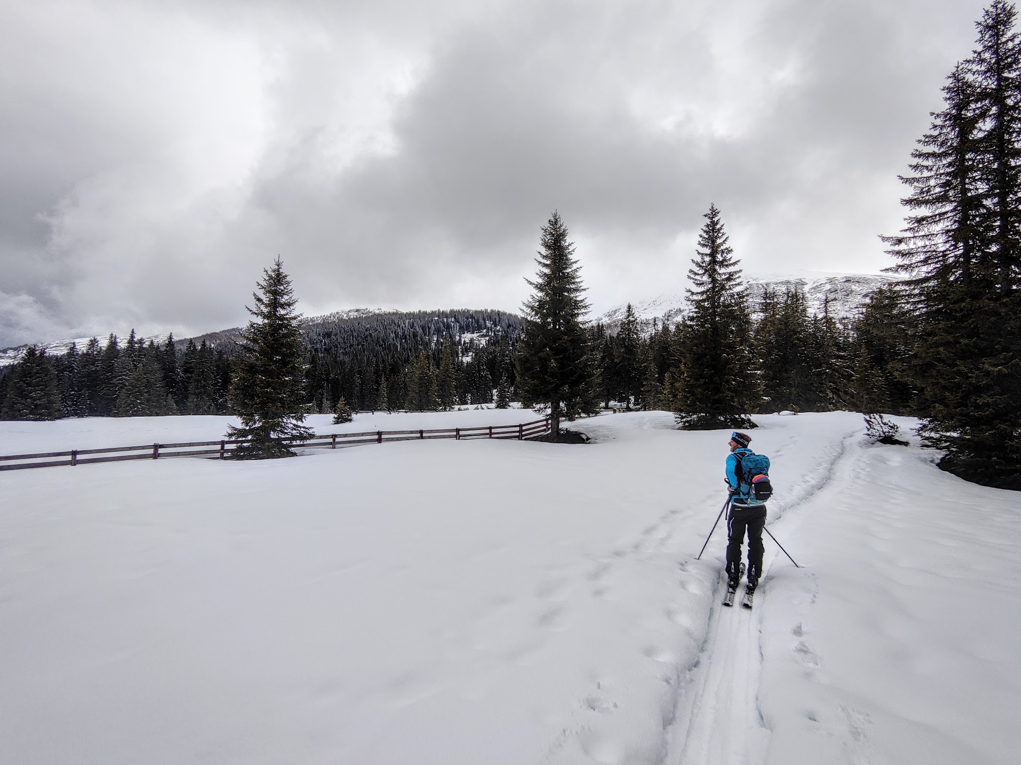 Nachdem aktuell die Skitourensituation schneebedingt im Gelände kaum eine Option ist, teile ich diese feine, relativ lawinensichere Runde in Sexten im Südtiroler Hochpustertal, die ohne steile Bergaufpassagen auskommt und über sanftes, weites Almgebiet führt. Eine schöne Erinnerung von Ende März, welche wettertechnisch viel zu bieten hatte – kurzer Regen, leichter Schneefall, dezente Sonne auf der Alpe Nemes & (leider) viele fette Wolken. Nach der Skitour vom Vortag (-> Skitour Sextner Stein 2539m, Drei Zinnen ) der perfekte Abschluss vor der Heimfahrt.