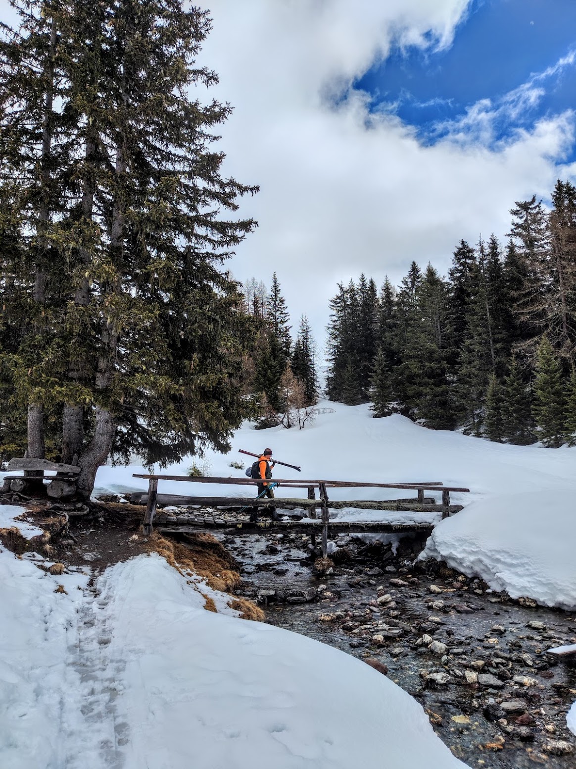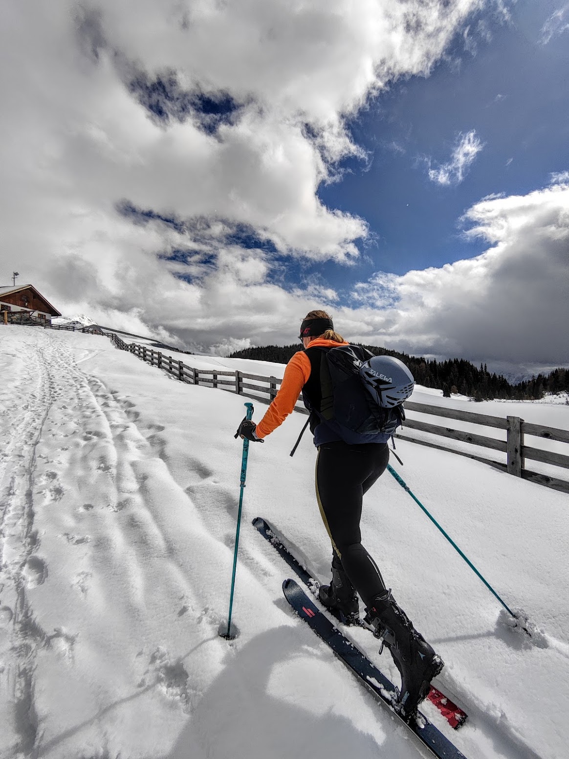 Direkt vom Wanderparkplatz aus losgehen ist immer gut. Dieser befindet sich am höchsten Punkt des Kreuzbergpasses, der das Sextental mit dem Cadore in Italien verbindet. Diese Skitour folgt nur abschnittsweise dem Forstweg / Winterwanderweg – ansonsten ist man im freien Gelände unterwegs. Durch das sanfte Almgebiet sowohl eine super gute, defensive Wahl bei hoher Lawinenwarnstufe als auch eine perfekte Anfängertour. Im Sommer befindet sich dort sicher ein wunderschöner Almboden – danach gehts vorbei beim Seikofel-Nemes Biotop (Moor). Ein kurzes Stück auf der Langlaufloipe entlang. Unterhalb der Alpe Nemes wartet ein kurzes Tragestück über eine Brücke. Die letzten Meter zur Hütte wartet (normalerweise) ein grandioses Rotwand-Panorama, aber es hat leider einfach nicht aufgerissen. Zumindest ein paar Sonnenstrahlen während den letzten Metern und auf der Sonnenterasse waren uns vergönnt – dazu eine hervorragende Buchweizentorte. Abfahrt zum großteil am Forstweg mit ein paar Abkürzern über die Loipe. Aber jetzt lass ich Bilder sprechen und widme mich wieder dem Schneetanz, damit Frau Holle die nächste (dringend benötigte) Ladung vorbereitet…
