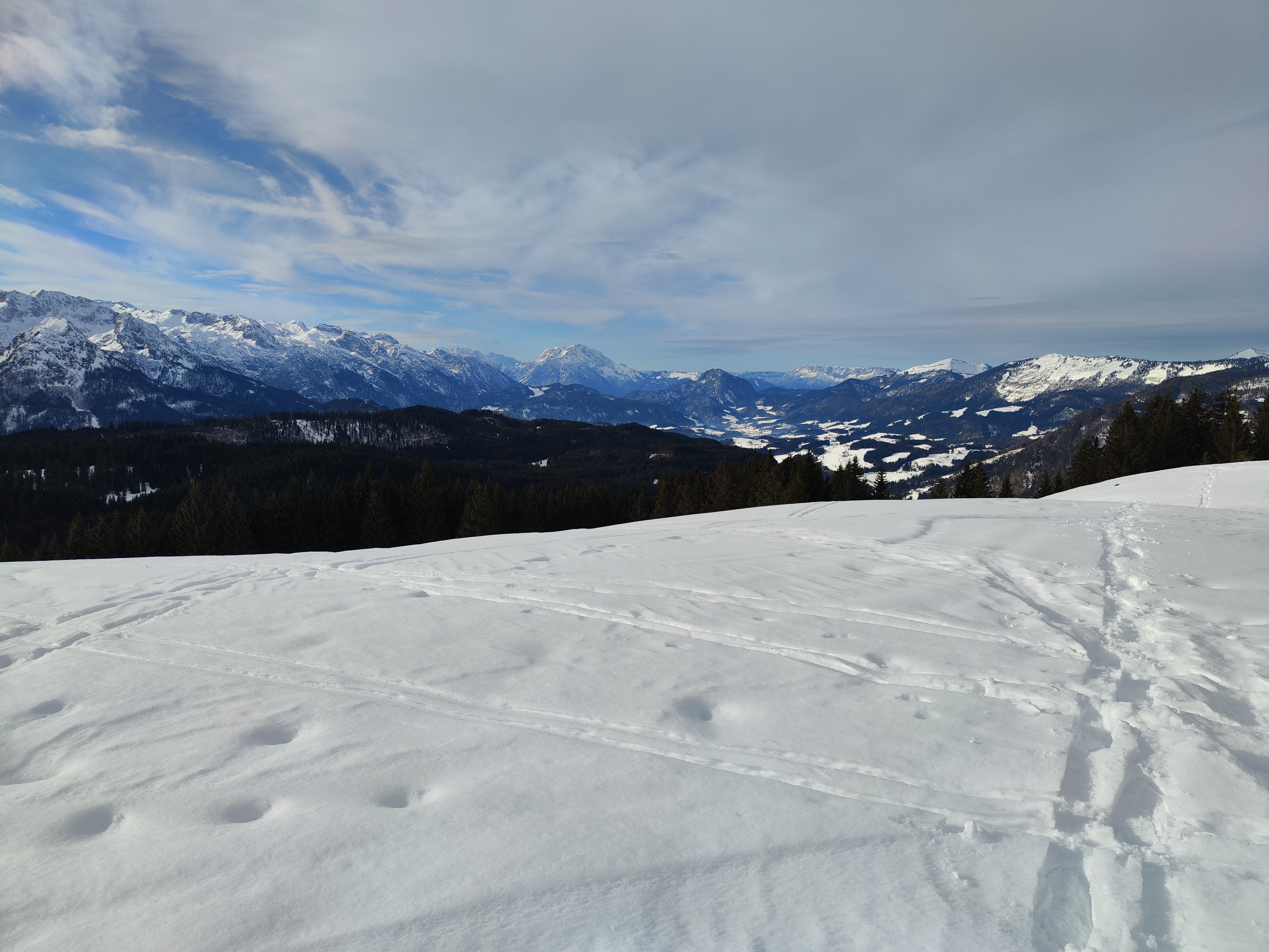 Dort wo im Sommer Brunos Bergwelt zu finden ist, eröffnet sich seit diesem Winter eine ganz eigene Welt. Ein neuer Schneeschuhtrail entführt ins freie Gelände mit unerwartet gewaltigen Ausblicken – aber dazu später mehr. Erst werde ich mit Schneeschuhen und Stöcken im Gosauer Skiverleih versorgt und dann geht’s ganz entspannt per Hornspitzexpress in 2 Teilstrecken mit dem Sessellift nach oben. Ohne Ski ist irgendwie ungewohnt aber die Neugier ist eh stärker. Angekommen bei der Bergstation ist die erste Schneeschuhtrail Nr. 2 Markierung schon zu sehen – sie steht rechts neben dem Ausgang der Hornbahn und weist den Weg nach unten zum Russbach-Panoramaplatzl. Von dort links unter der Gondel durch und dem Wegverlauf folgen. Sofort wird es ruhig rundum. Entweder steigt man nach kurzer Gehzeit nach der ersten Kurve links zum Gipfel auf 1433m oder erst beim Rückweg (meine Variante). Weiter leicht bergab im Wald mit gewaltigen Dachstein Panorama – dort entstand das Titelbild dieses Beitrags. Beim Ochsenkopf-Schlepplift angekommen quert man kurz & mit Vorsicht die Piste, um am linken Rand erst mit Gosaukamm im Blick weiter zu marschieren. Die nächste Markierung rechts weist die Querung der Lifttrasse (bitte auf die Schleppliftfahrer achten), nach gut 100m auf dem Ziehweg wird links über sanftes Gelände zur Bergstation aufgestiegen. Das ist heute die zweite Premiere, spuren darf ich selber. Bei Bruchharschdeckel oben und Pulver drunter gar nicht so unanstrengend. Aber es geht ja sowieso nicht um Geschwindigkeit, sondern ums (Aussicht) geniessen und das geht langsam besser. Bei der Ochsenkopfschlepper-Bergstation angekommen am Pistenrand den bekannten Weg retour und je nach Lust & Zeit entweder direkt via Gogosau Alm (kürzere Variante) oder auf gleichem Weg abseits der Piste hinter dem Hornspitz. Ich wähle letzteres, weil sich jetzt auch die Sonne endlich zeigt und das Gipfelpauserl noch schöner macht. Auf dem Weg stoppt mich allerdings noch eine Flugvorführung der besonderen Art – eigentlich bin ich ja mitten im Skigebiet und doch in dem Moment ganz weit weg davon. Natur pur. Der letzte Aufstieg im Wald Richtung Gipfel, geschafft!