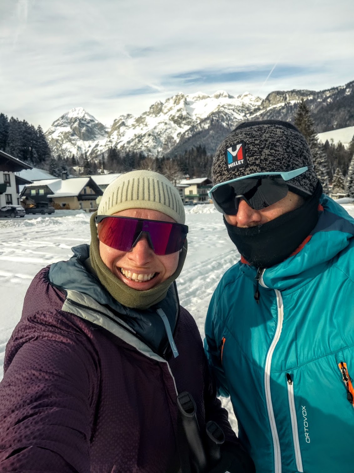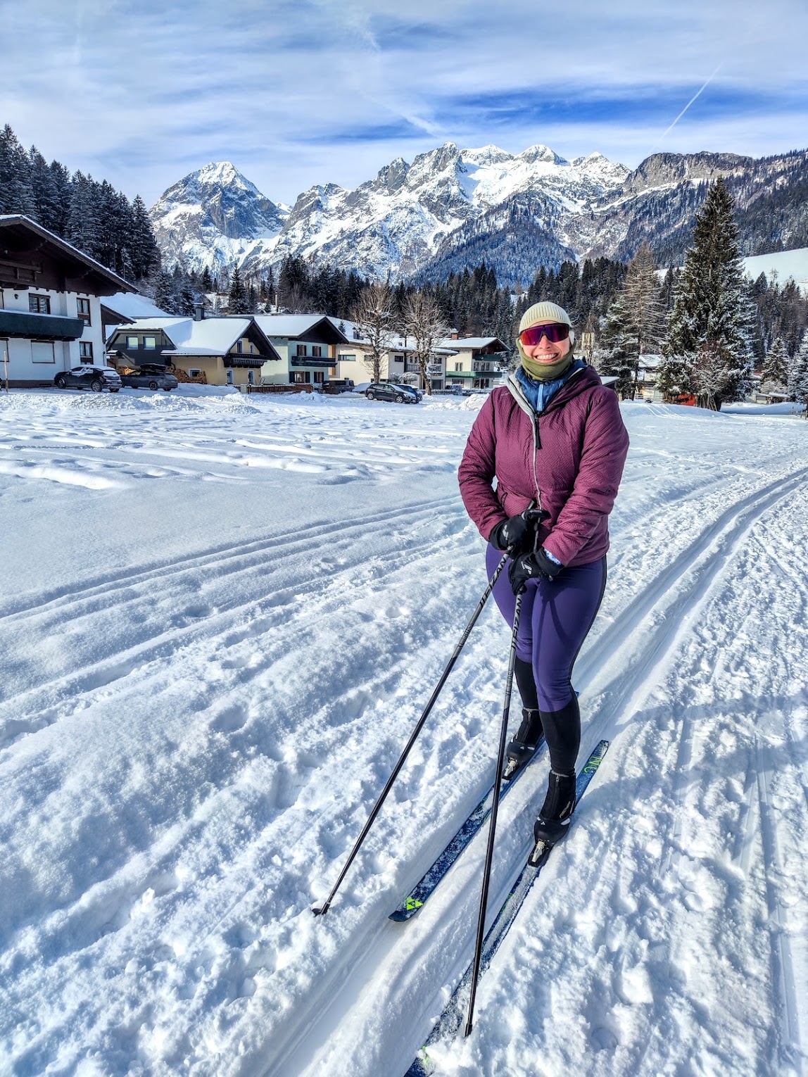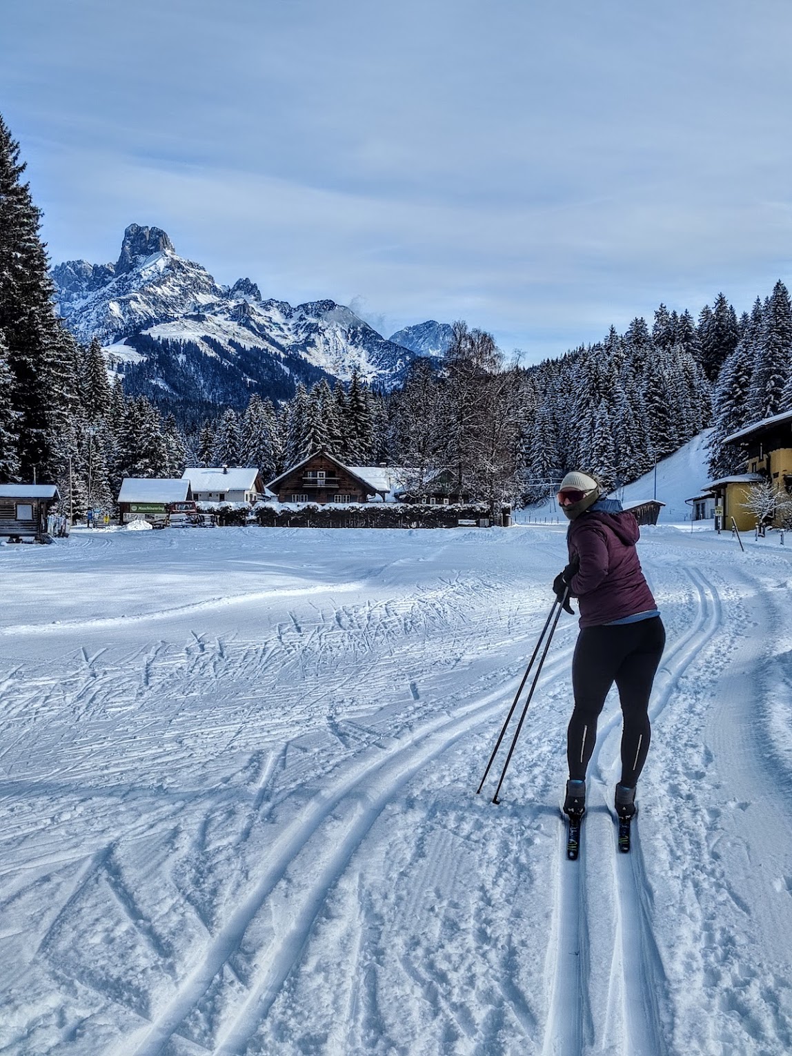 Ecken entdecken, diesesmal im Bankräuber-Style weil huschi kalt. – 8 Grad, 1x Jacke zuviel. Jedes Jahr beim ersten Mal der gleiche Fehler wenns so kalt ist. Nach den ersten 100m wird’s (immer) wärmer. Kurz nach dem Start direkt am Parkplatz nahe der kleinen Kirche in Lungötz schiebt sich die Bischofsmütze in mein Blickfeld, ein Stück weiter zeigt sich auch der Gosaukamm mehr. Die Loipe folgt dem Neubach und ist einfach – sie hat keine großen Steigungen. An dem Tag wird gerade frisch präpariert und somit ist die gesamte Strecke gespurt. Eine wirklich schöne Runde (auch für Anfänger) in den ruhigen Talschluss, retour dann mit Tennengebirge-Blick. Trotzdem macht man ein paar Höhenmeter, die mir aber erst im nachhinein auf der Uhr auffallen. Abends gibt’s hier übrigens sogar eine 2,5km Flutlichtrunde! PS: weil die Loipe und die Ausblicke so schee gwesn san, dann doch irgendwann wieder froh um die Jacke zuviel gewesen – stehn, schaun und geniessen statt hoher Pace war Motto des Tages.