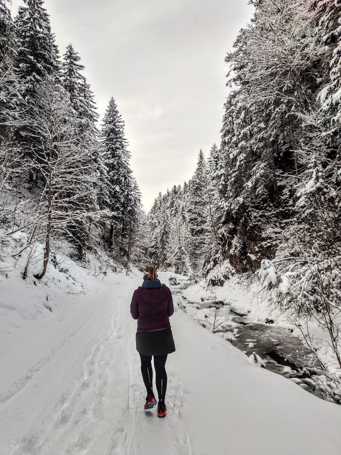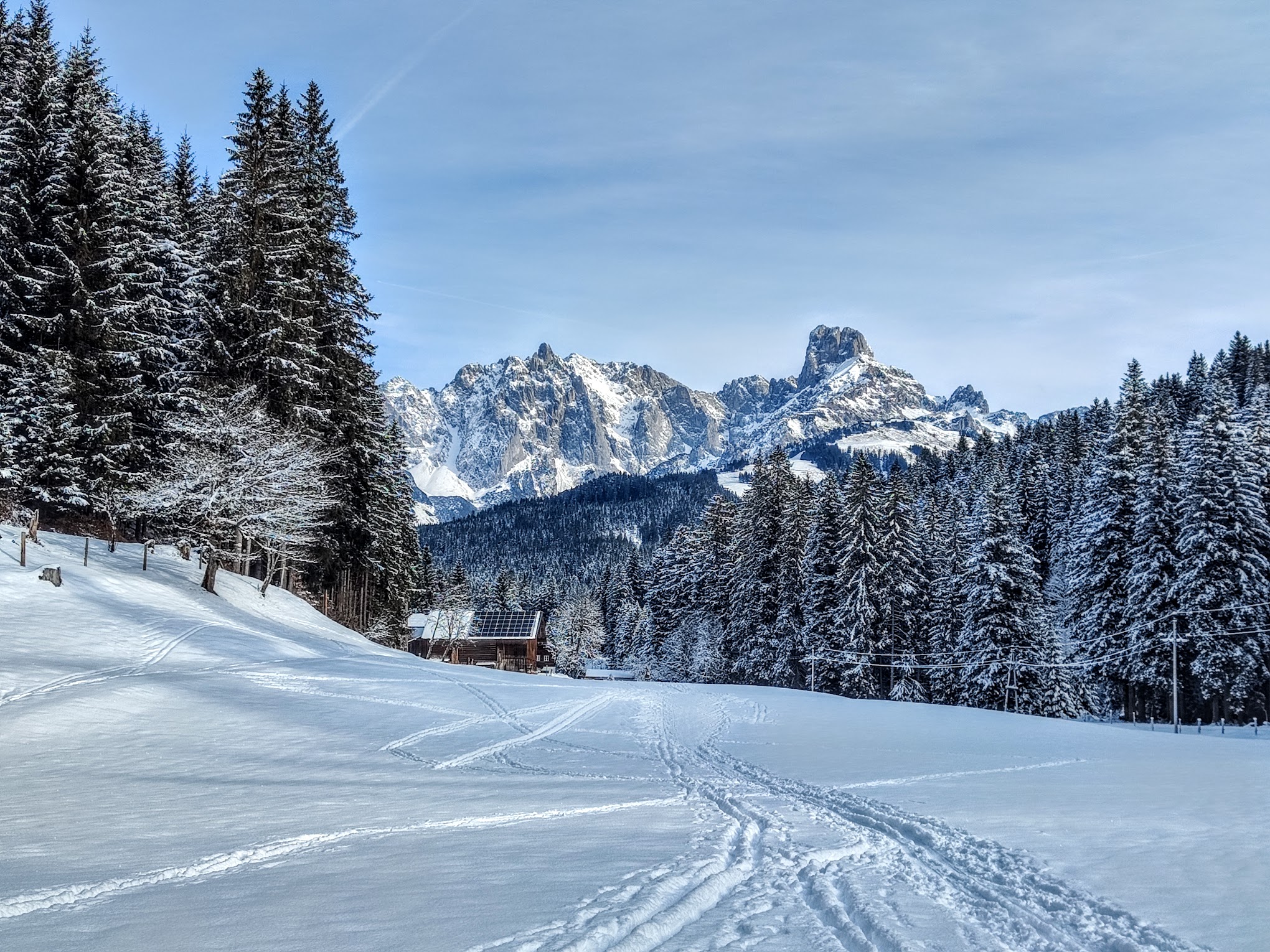 Parallel zur Langlaufloipe (bitte nicht betreten) führt eine ruhige, wenig befahrene Strasse leicht bergauf in den Talschluss, die sich super zum Winterwandern eignet. Komplett mit Schnee bedeckt schlängelt sie sich durch Lichtungen in das Seitental. Die markante Bischofsmütze im Gosaukamm zeigt sich in Koppensau in voller Pracht, verschwindet beim weitergehen in Richtung Talschluss aber wieder aus dem Blickfeld… Wir sind hinten in Schichl nach dem Marterl noch a Stückl weiter am Forstweg den Neubach aufwärts spaziert – huschi koid owa so vü schee & bis auf’s rauschen des Neubachs unterm Eis komplett ruhig! Beim retourgehn auf der Forststrasse schaut man wieder aufs Tennengebirge. Einkehren, aufwärmen & guad essen? Da kommt man am Gasthof Restaurant Schichlreit nicht vorbei – es liegt direkt an der Loipe bzw der Strasse im Talschluss. Beim nächsten Mal ist ein Besuch bei der lieben Maria Haigermoser dann auch fix eingeplant! Weil: Regionalität wird groß geschrieben – viele Produkte sind aus der eigenen Landwirtschaft und von heimischen Betrieben aus dem Lammertal & Abtenau. Und selbstgemachte Mehlspeisen warten auch! Danach gibt’s fix ein Update hier drin… Hin- wie Retourweg, gesamt ca 9km & 120hm.