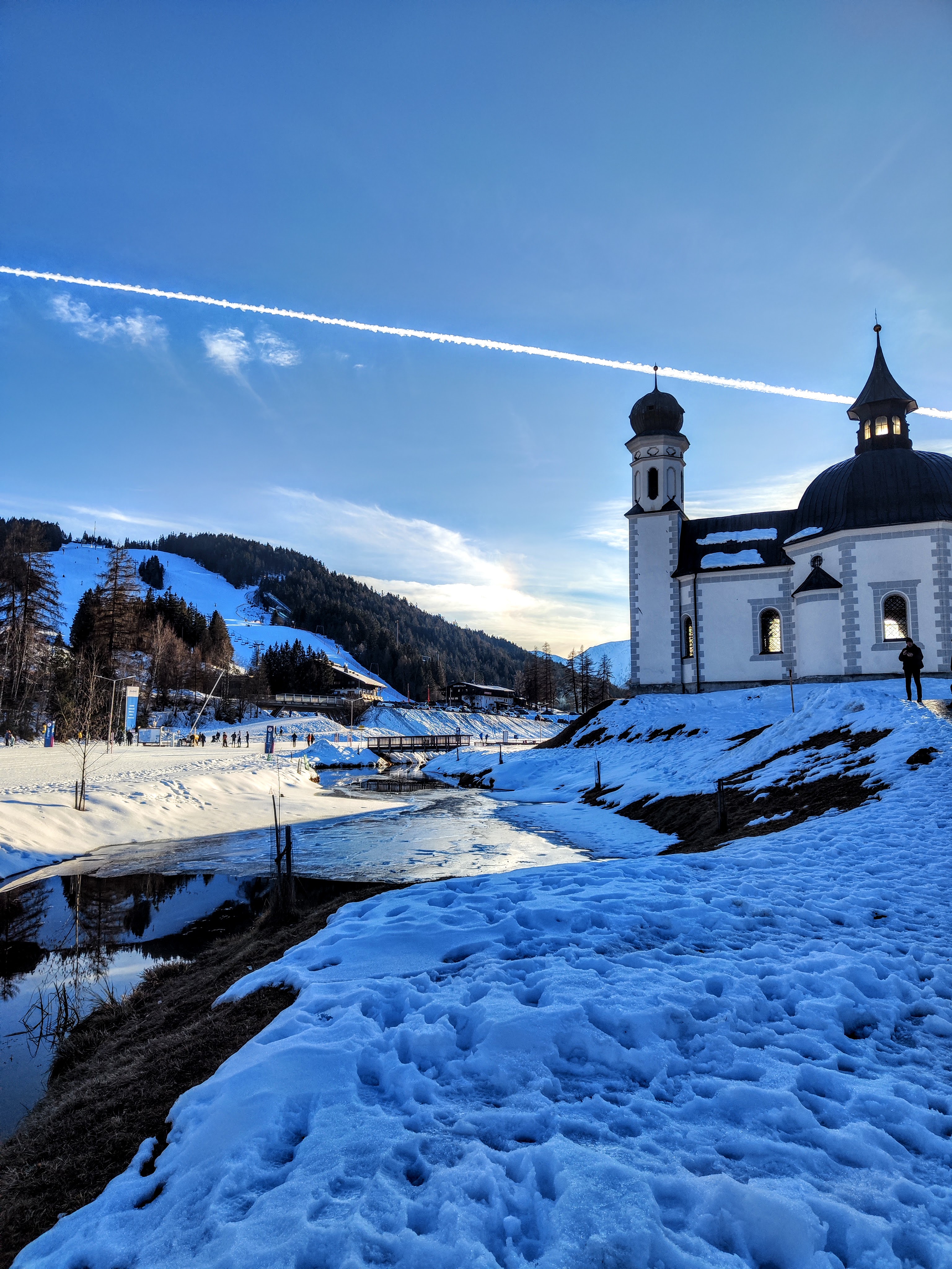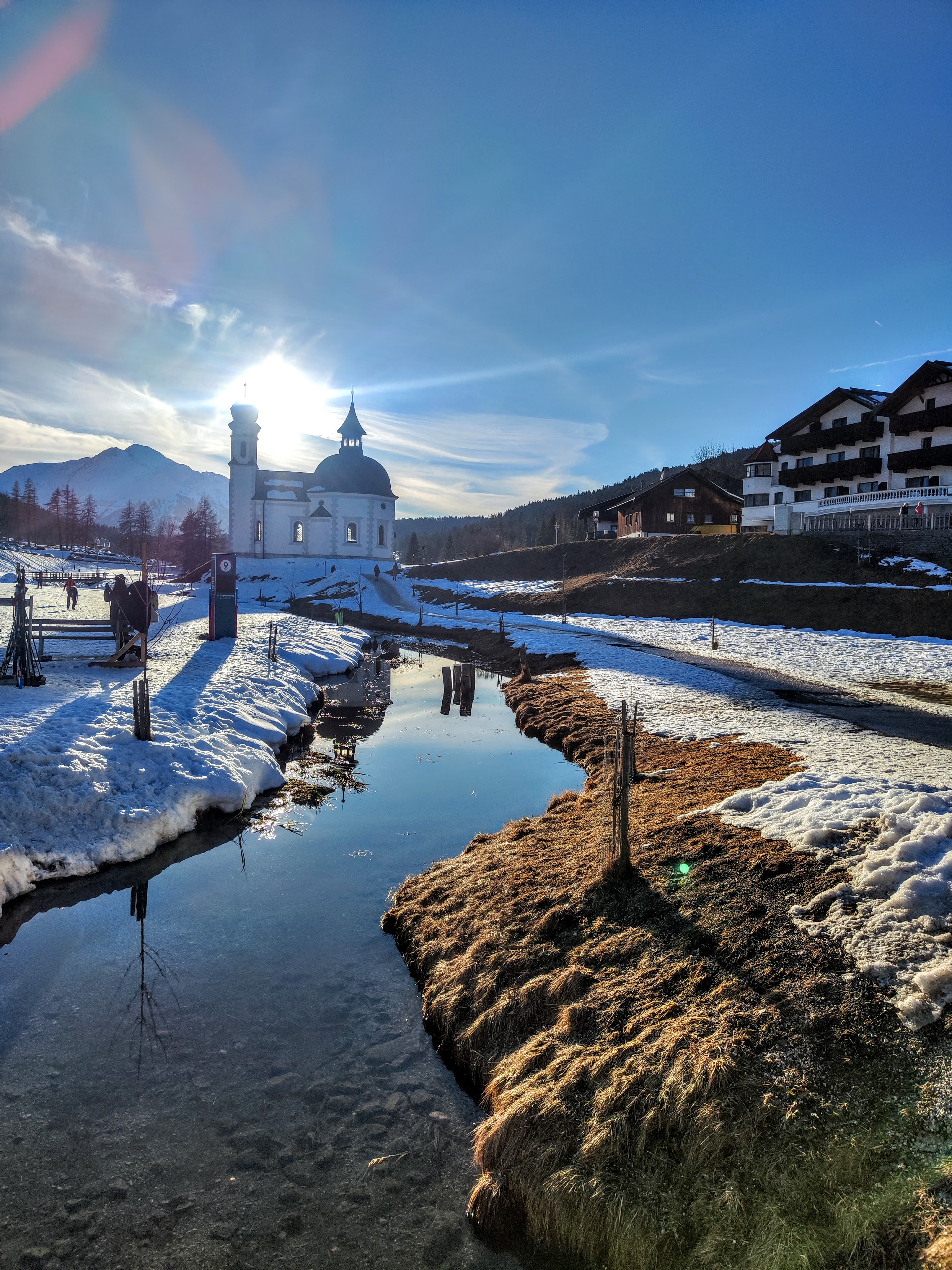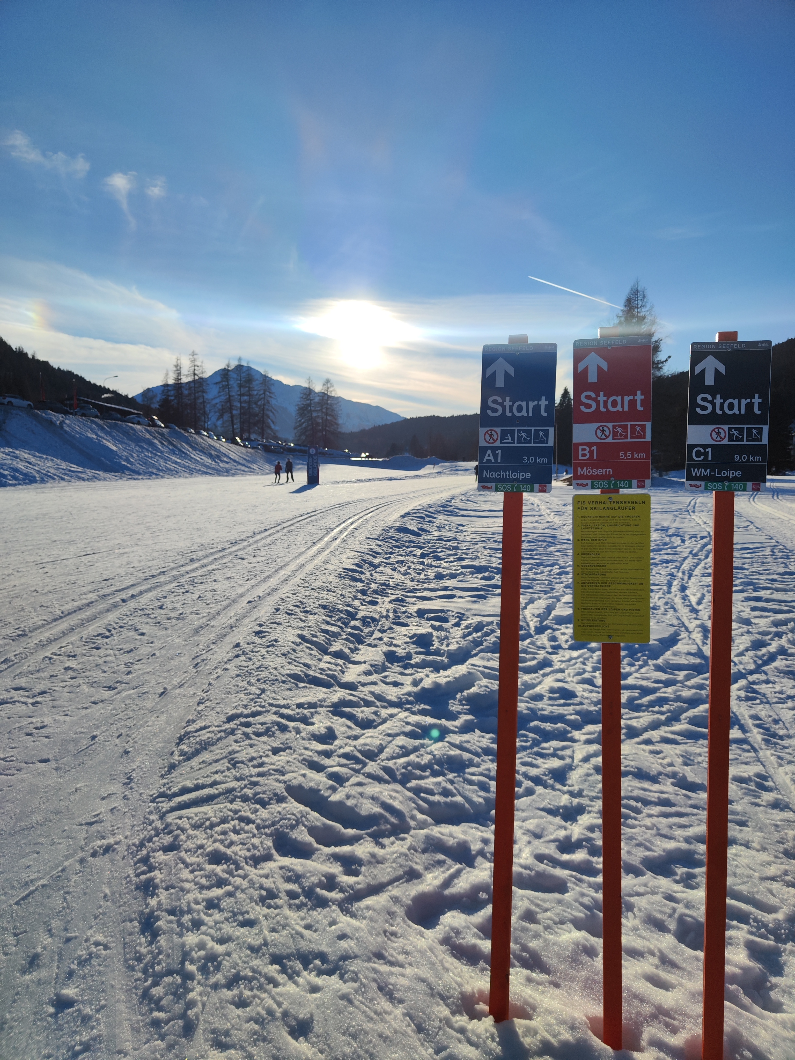 Klassischer Stil oder Skating – was darfs sein? Für mich stellt sich die Frage nicht, da ich kniebedingt klassisch unterwegs bin – die Loipe bietet aber natürlich die Möglichkeit für beides. Beim bekannten Seekirchl nahe dem Zentrum von Seefeld starten die breiten Loipen – zu Fuß ganz einfach erreichbar oder per Skibus (gratis mit Gästekarte bzw Loipenticket). Erst geht’s durch die Langlaufarena (A1, blau), welche perfekt zum üben und Genusslaufen ist – und das Panorama kann sich auch sehen lassen. Rüber zum schroffen Wettersteingebirge oder zur markanten Hohe Munde – sie hat uns immer begleitet – vom Hotelzimmer aus und unterwegs auf der Loipe…
