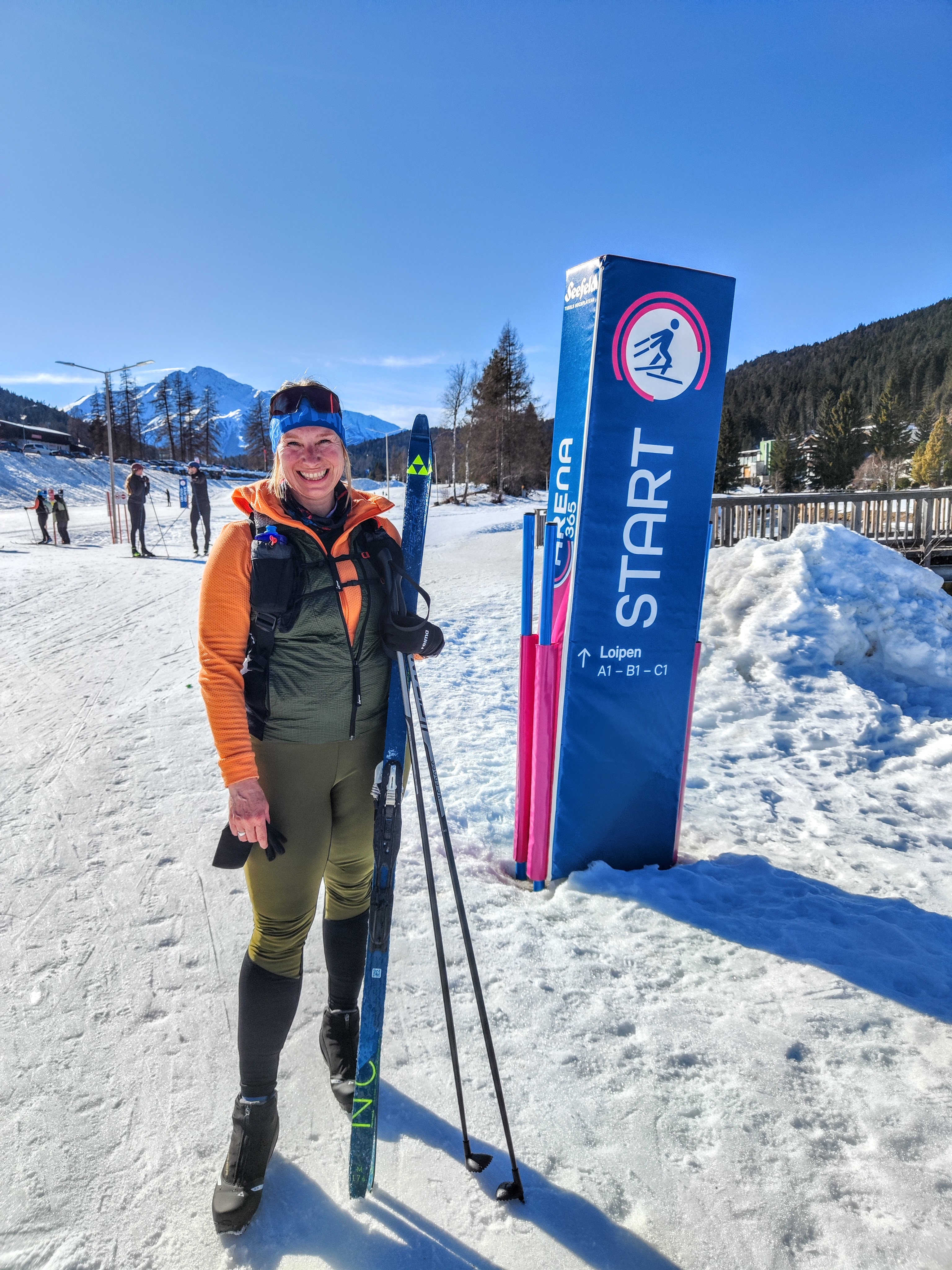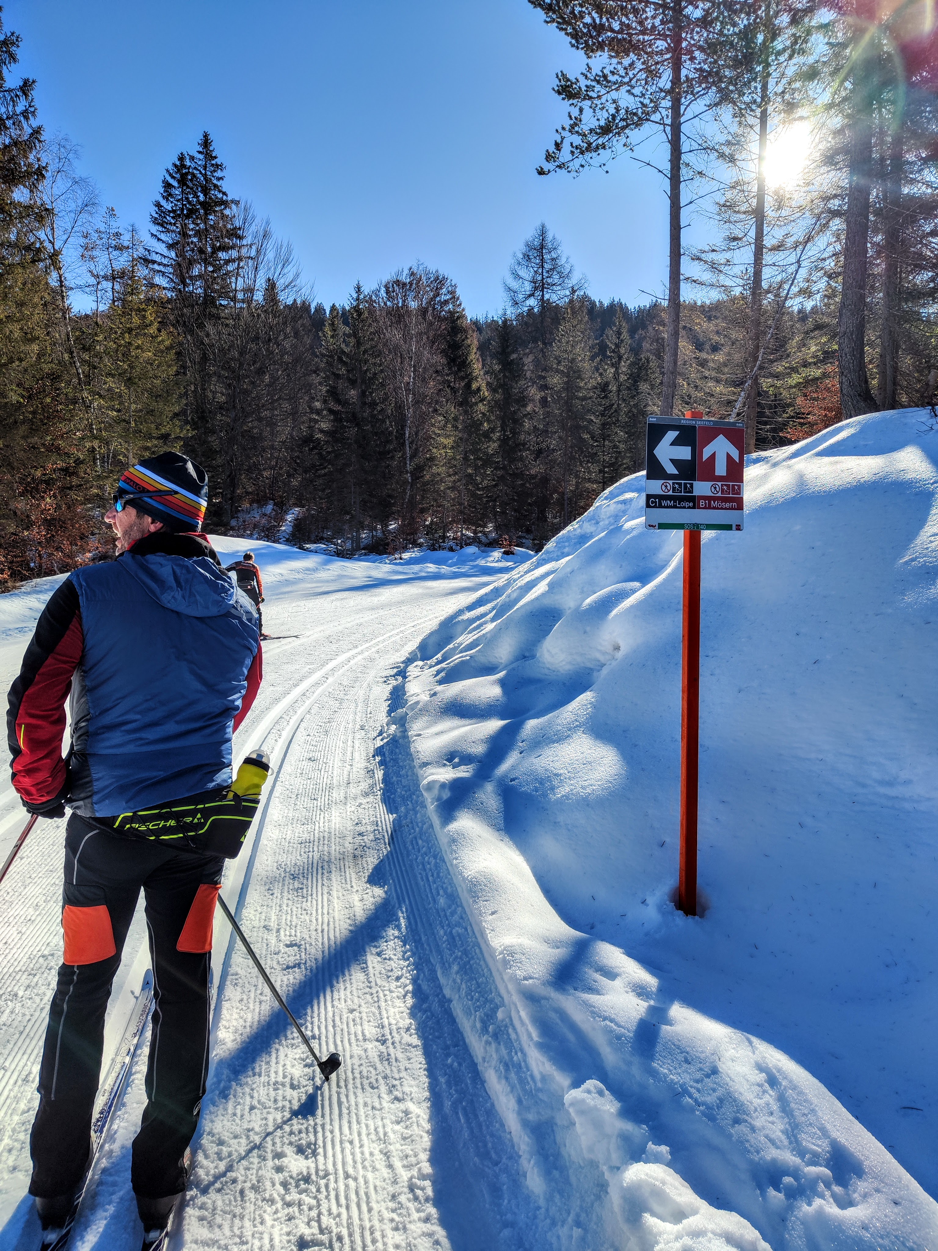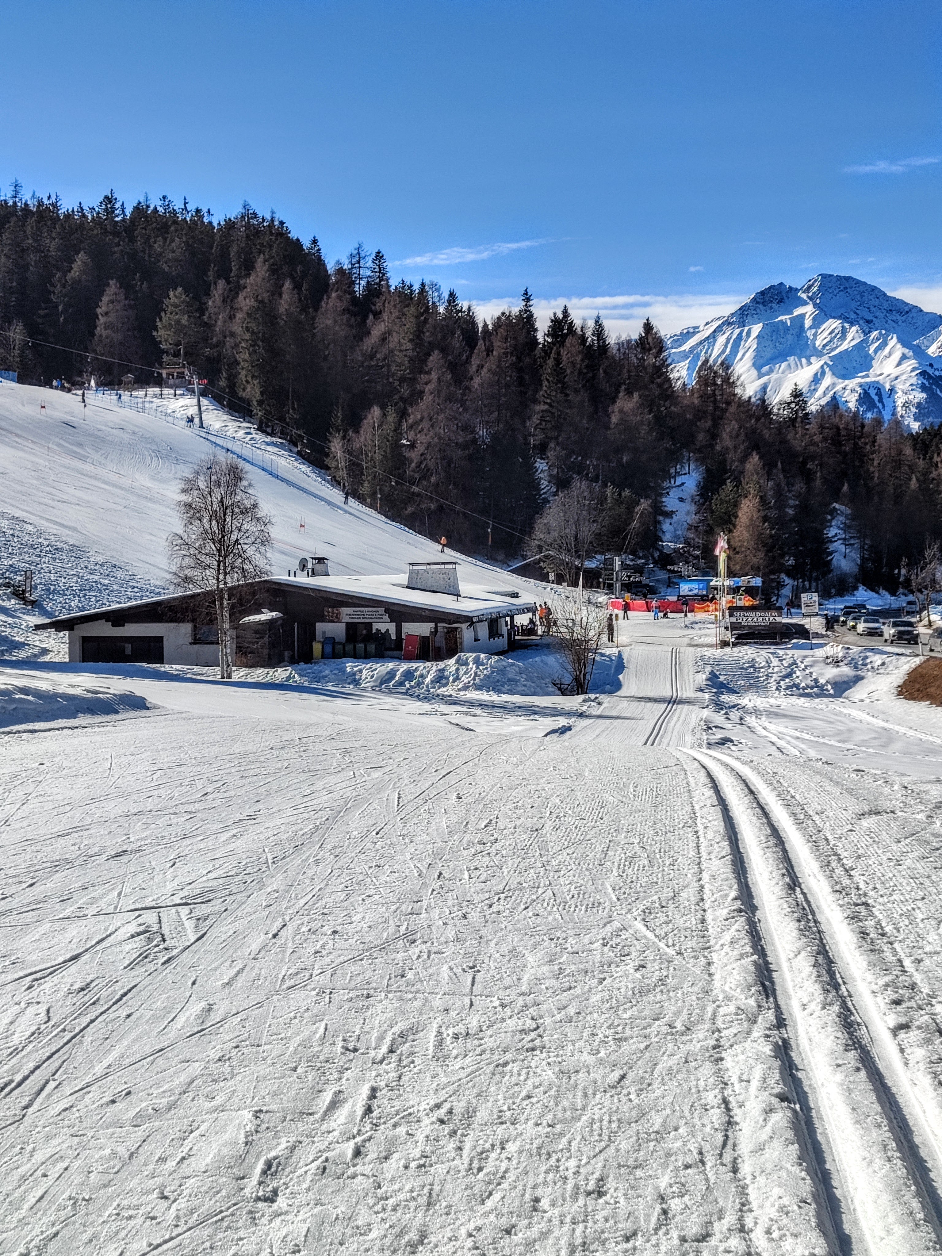 (Ferienbedingt?) war natürlich wirklich viel los auf den Loipen – aber eigentlich nur im A1 Bereich – auf der Mösern Runde (B1, rot) wars entspannter. Richtung Seewaldalm folgt der erste Anstieg, ein ganz schön steiler Abschnitt – Teil der C1 WM Loipe 2019 – es hätte aber auch eine weniger steile Variante gegeben. Die Loipe führt im Anschluss direkt an der Seewaldalm vorbei – da muss man ja quasi einkehren. Unser kurzer Terrassenstop fand erst an Tag 2 statt, weil wir’s an Tag 1 nicht eingeplant hatten. Da wollten wir weiter zum Möserer See (B10), aber erstens war Montag Ruhetag und zweitens ist die Loipe aktuell leider nicht befahrbar (aper). Aber zurück zur Seewaldalm, dort warten Pizza & Tiroler Schmankerl – erst beim gehen die Kühlvitrine drinnen gesehn, italienische Dolci wie Tiramisu im Glas & vieles mehr. Zu viel schlemmen ist allerdings keine gute Idee, direkt danach wartet wieder ein kurzer Anstieg – gefolgt von einer Abfahrt. Danach schön durch den Wald bis man im Aufstieg zur Kreuzung mit der besagten B10 Loipe (Möserer See) kommen würde – nützt nichts. Weiter bergauf, bevor es dann bergab geht. Die längste Abfahrt dieser Runde wartet, bevor es – erst bergauf, dann auf einer weiteren Abfahrt – Richtung A1 Arena retour geht. Aufbrennt hots mi a dezent trotz SPF 50 – da merkt ma die Höhenlage auf 1200m und dass die Sunn wieder mehr Kraft hat – unterwegs Trinken war also echt wichtig! Tipp: alle Loipen mit Einkehrmöglichkeit sind extra online in der Übersicht auf der Seefeld-Loipenseite aufgelistet!