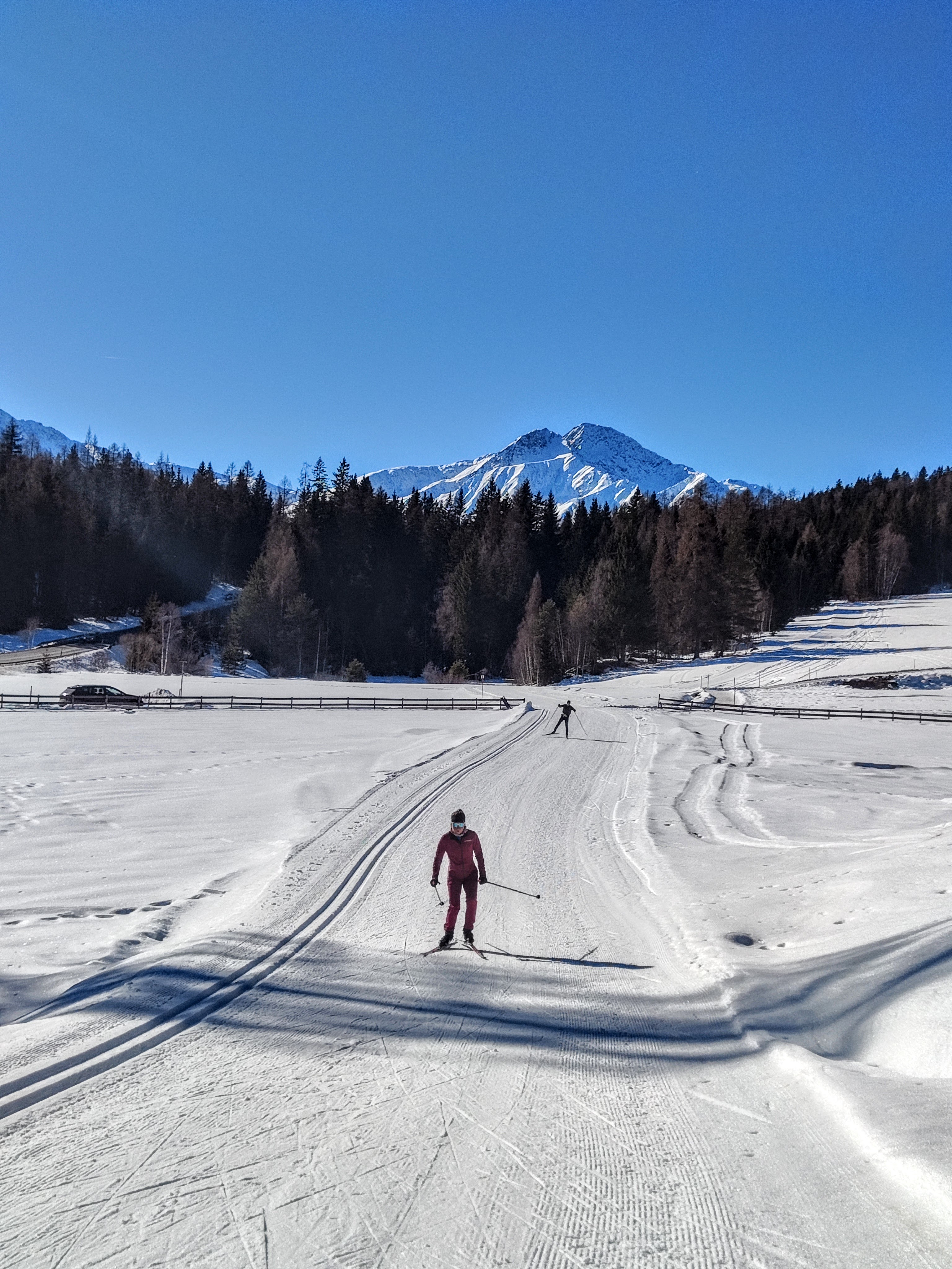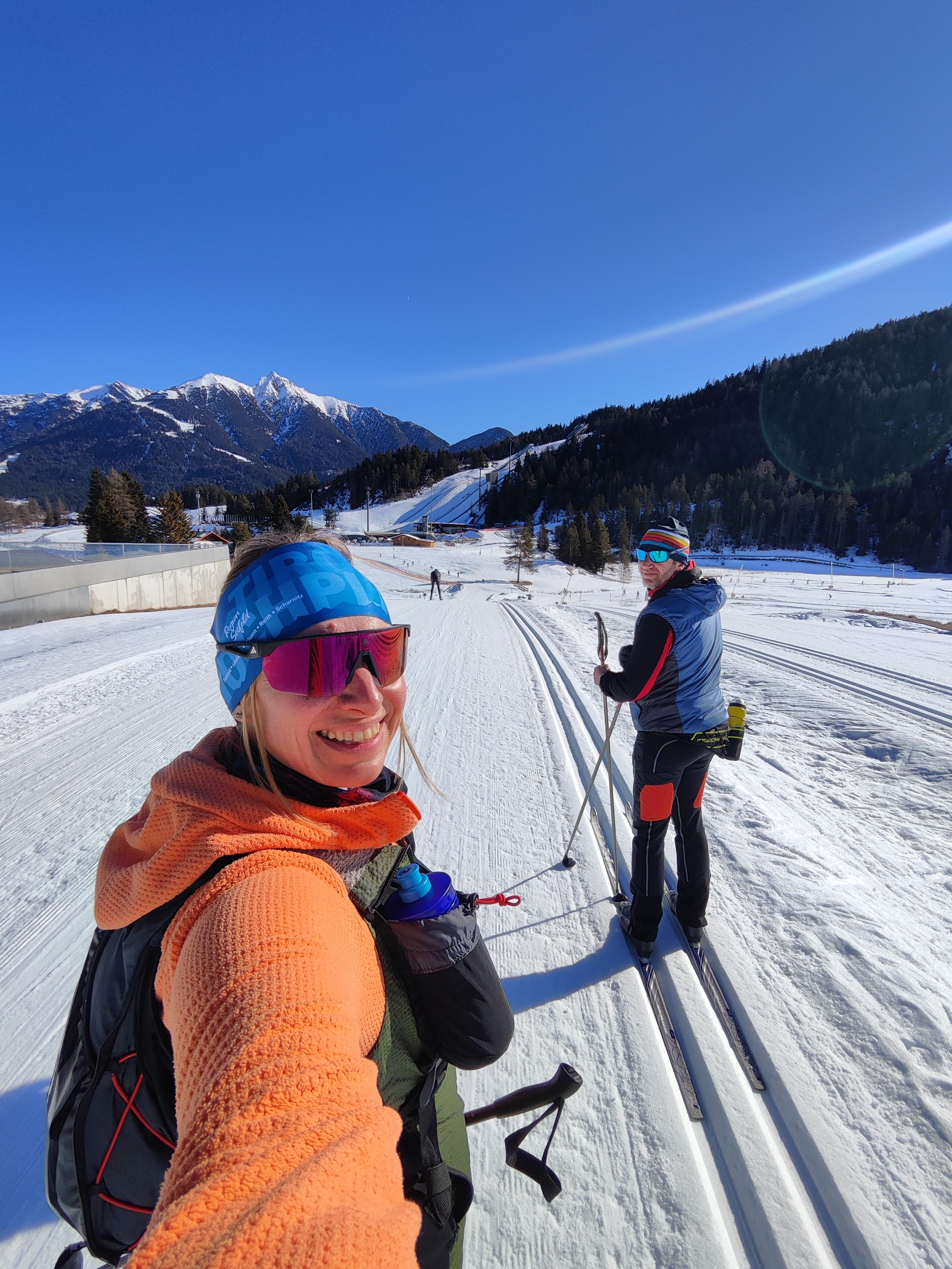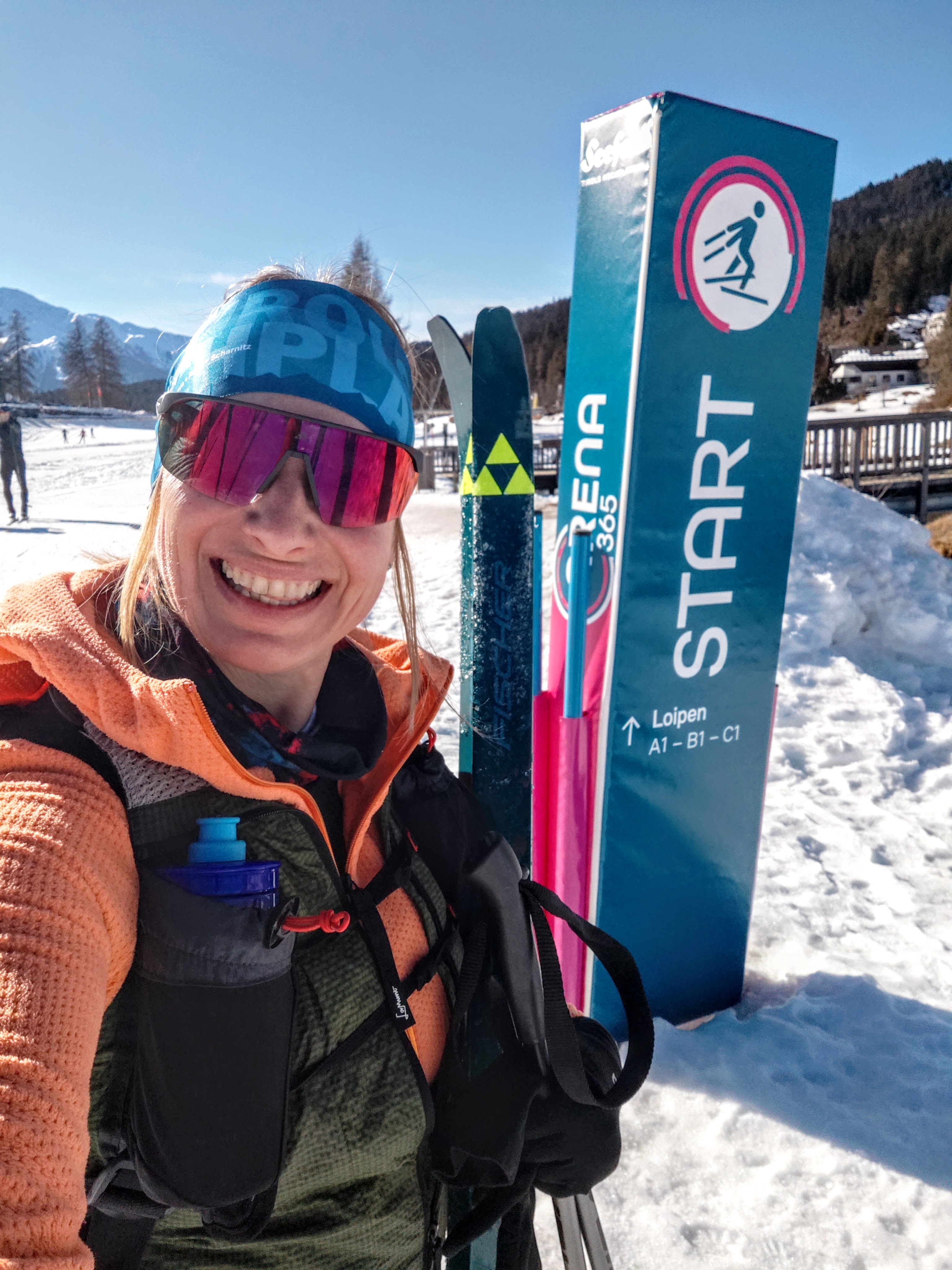 (Ferienbedingt?) war natürlich wirklich viel los auf den Loipen – aber eigentlich nur im A1 Bereich – auf der Mösern Runde (B1, rot) wars entspannter. Richtung Seewaldalm folgt der erste Anstieg, ein ganz schön steiler Abschnitt – Teil der C1 WM Loipe 2019 – es hätte aber auch eine weniger steile Variante gegeben. Die Loipe führt im Anschluss direkt an der Seewaldalm vorbei – da muss man ja quasi einkehren. Unser kurzer Terrassenstop fand erst an Tag 2 statt, weil wir’s an Tag 1 nicht eingeplant hatten. Da wollten wir weiter zum Möserer See (B10), aber erstens war Montag Ruhetag und zweitens ist die Loipe aktuell leider nicht befahrbar (aper). Aber zurück zur Seewaldalm, dort warten Pizza & Tiroler Schmankerl – erst beim gehen die Kühlvitrine drinnen gesehn, italienische Dolci wie Tiramisu im Glas & vieles mehr. Zu viel schlemmen ist allerdings keine gute Idee, direkt danach wartet wieder ein kurzer Anstieg – gefolgt von einer Abfahrt. Danach schön durch den Wald bis man im Aufstieg zur Kreuzung mit der besagten B10 Loipe (Möserer See) kommen würde – nützt nichts. Weiter bergauf, bevor es dann bergab geht. Die längste Abfahrt dieser Runde wartet, bevor es – erst bergauf, dann auf einer weiteren Abfahrt – Richtung A1 Arena retour geht. Aufbrennt hots mi a dezent trotz SPF 50 – da merkt ma die Höhenlage auf 1200m und dass die Sunn wieder mehr Kraft hat – unterwegs Trinken war also echt wichtig! Tipp: alle Loipen mit Einkehrmöglichkeit sind extra online in der Übersicht auf der Seefeld-Loipenseite aufgelistet!