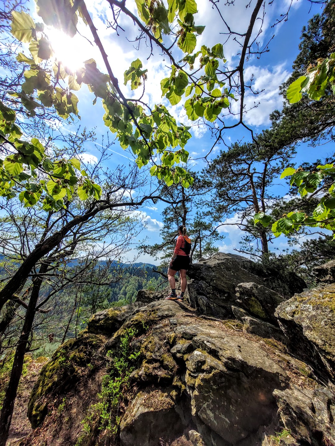 Nachdem wir Inzell erreicht haben, vorbei an der kleinen St. Nikolaus Kirche und ab in den Wald – die Höhenmeter warten. An einem Panoramabankerl mit Donaublick stoppt mich ein Schild mit folgendem Spruch: „wannst weche haxn host und kannst net weiter gehn, dann bleib am bankerl sitzen weil da is a recht schön“. Danke für’s Angebot, geht grod nu. Jetzt führt der Weg jetzt als schmaler Steig nach oben. Alles staubtrocken, da ist sicher aktuell die Waldbrandschutzverordnung auch schon in Kraft. Mein Lieblingsabschnitt der ganzen Runde folgt genau jetzt: der Aufstieg zum Steiner Felsen durch bizarre Kiefern und ein Meer aus Schwarzbeersträuchern… so schee! Der Weiterweg ist ein sanftes Auf- & Ab, immer wieder mit Donaublick. Angekommen beim großen, schattigen Aussichtsplatz mit Marterl – der Blick vom Steiner Felsen führt zurück nach Schlögen. Den kleinen Steiner Felsen nimmt man beim weiterwandern auch noch mit.