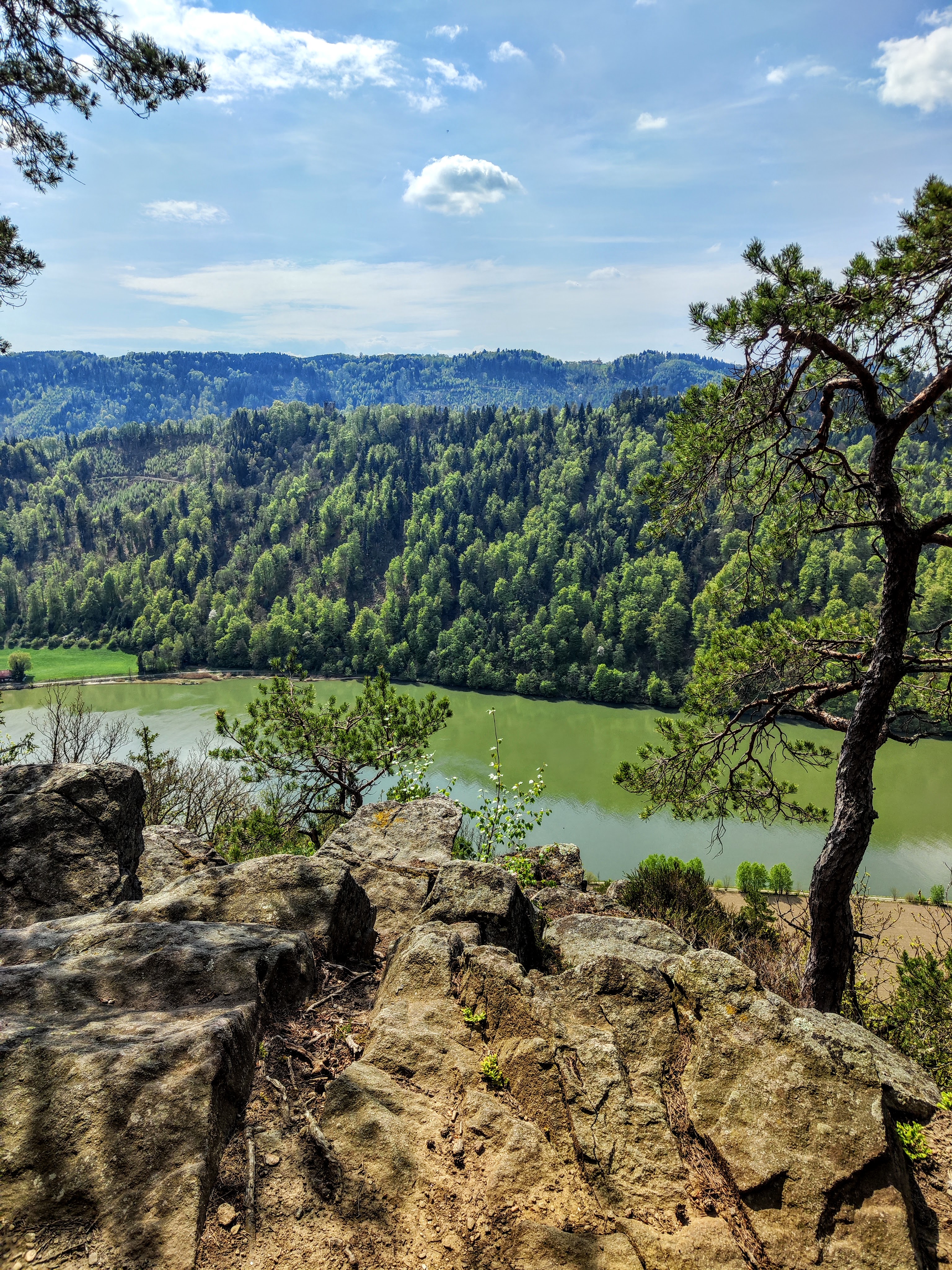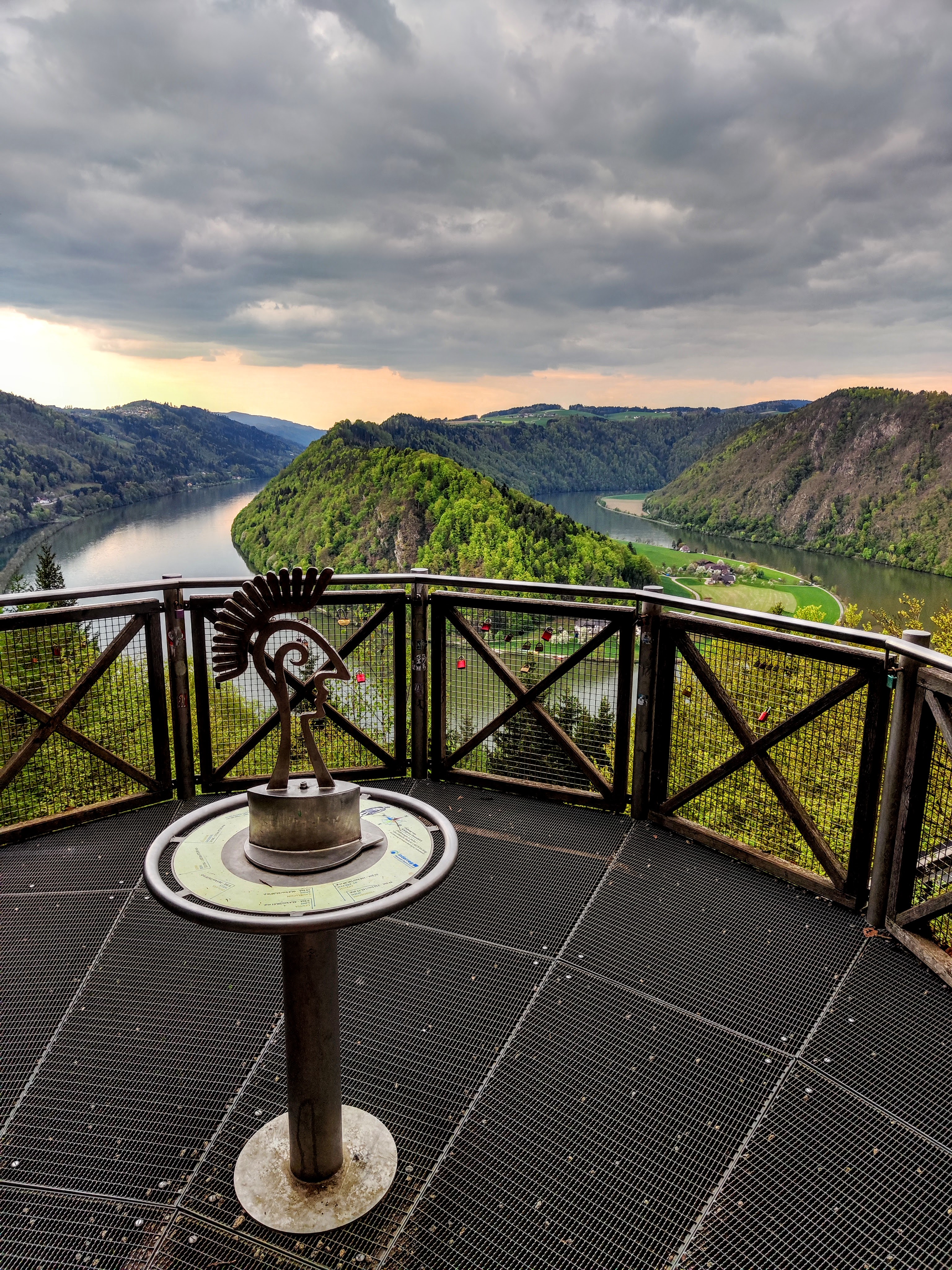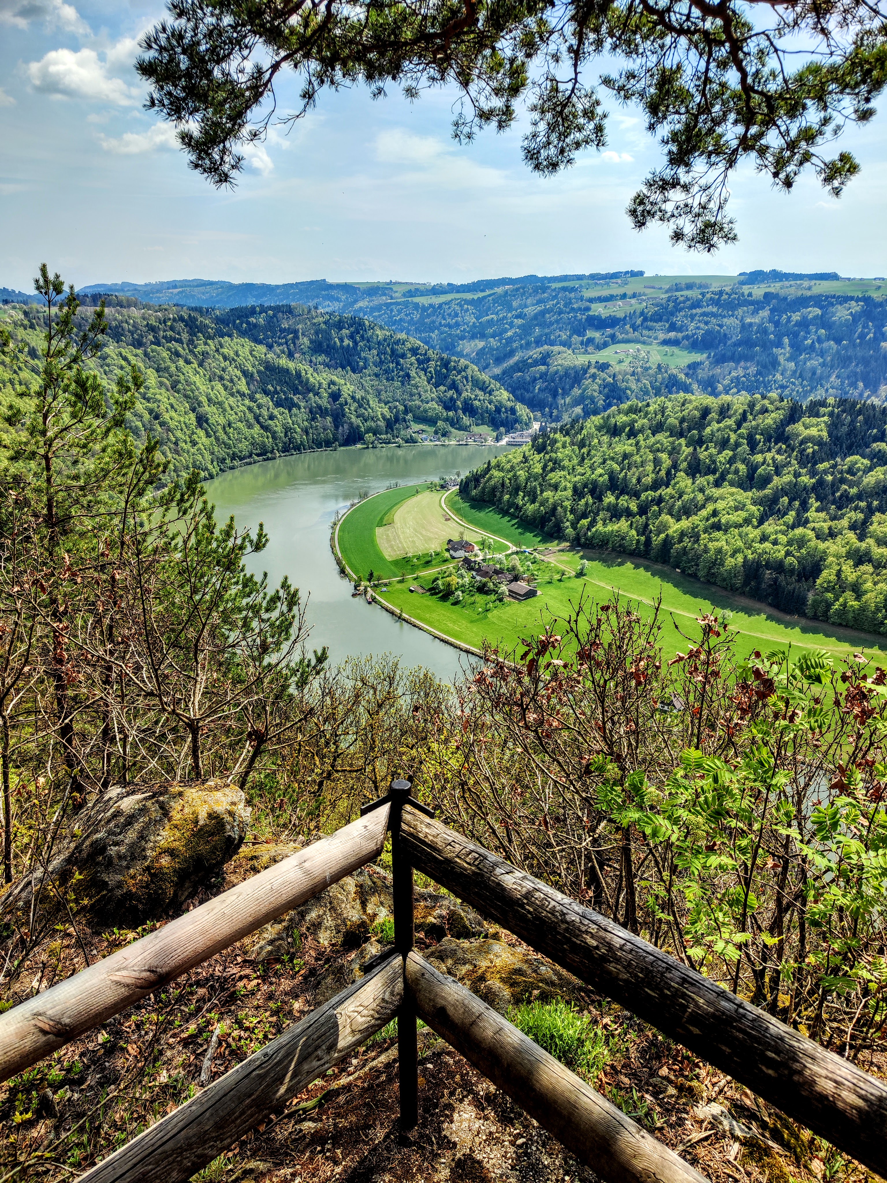 Raus aus dem Wald, rein in die Wiesen, vorbei an Bienenstöcken und blühenden Sträuchern. Hier führt der Ciconia Rundweg erst am Waldrand und dann quer über weite Felder (bitte am Weg bleiben), durch Linetshub an Teichen vorbei, bevor er wieder in den Wald eintaucht… und die ersten Tropfen Aprilregen gabs als Bonus obendrauf. Nach passieren des Roten Kreuzes geht’s auf einem breiten Schotterweg zum Aussichtspunkt Schlögener Blick. Begehrt – verständlich. Hab 15 Minuten geduldig gewartet, bis i ein schnelles Foto ohne Menschen machen konnte. Dank dunkler Wolken stimmungsmässig a gewaltiger Abschluss der Runde, die man von hier komplett im Blick hat. Gestartet erst am Wasser unten bis Inzell, dann bergauf im Wald zum Steiner Felsen und den kompletten, rechts ersichtlichen Kamm retour. Der Abstieg nach Schlögen führt durch den Wald und ist teilweise steil – dafür ist man schnell unten.